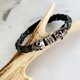 皮革编织穿入两颗特制骷颅头+纯银段敲手环,选用植鞣皮绳纯手工编织完成,加上999纯银段敲,皆可定制 有不同的皮革颜色及编法可供选择,也可依照个人需求打上不同文字,打造出独一无二得个人化饰品