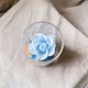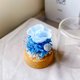 《浪语微光》以海洋的纯净与浪花的轻语为灵感,选用不同层次的蓝色花材,仿佛将大海的宁静与生机封存在玻璃盅中。淡蓝色的玫瑰如同海面上温柔的波光,深蓝绣球花则象征海洋深处的神秘与辽阔,而银色点缀宛如月光洒落海面的微光,为整体增添浪漫的梦幻气息。