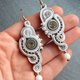 这款精致的白色耳环采用索套刺绣(soutache embroidery)工艺制成,适合婚礼或新娘造型。材质包含珠饰、细致的种子珠与索套绳,背面则以皮革包覆,轻巧无负担。