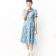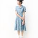 【RE1004D1413】早秋复古甜美浪漫变形虫印花碎花短袖水蓝色古着洋装