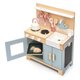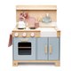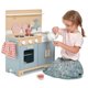 此套组包含一个实木白色水壶、2个杯子和茶碟、3个餐具和1餐具架。一条方格布艺茶巾、1块肥皂,一条法式长棍面包,以及1个烤盘,也可用于覆盖水槽区域,为假扮游戏提供额外的工作台面。