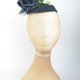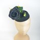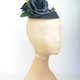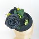 硕大的黑色玫瑰、莱姆绿的苹果与蚱蜢,搭配黑色网纱及叶片装饰。黑色毡帽底座直径约 15 厘米,整体高度约 11 厘米。以金属发夹固定于发上。
