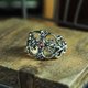 以源自蔓生植物的唐草花纹基底,变化出戒身两侧华丽对称的心形线条,仿旧的色泽加上闪亮的碧玺,是喜爱复古风格的你不能错过的个性饰品。