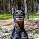 Looking for a one-of-a-kind dog muzzle? How about this one here? Werewolf dog muzzle! Black in color, this custom painted dog muzzle features a realistic dog nose along with large scary teeth!