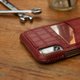 *屏幕加强防撞-使用人字缝线工法将皮革紧紧包覆于屏幕周围一圈厚达0.8mm锰钢防护环,手机不慎落地时借由环状传导原理将撞击力道平均扩散,降低屏幕碎裂风险