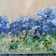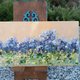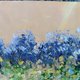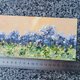 这幅画描绘了一片蓝色花朵、绿色叶子和柔和的米色背景的田野。