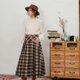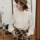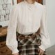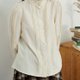 木耳蕾絲邊立領的襯衫,偏米的色調使她並不甜膩,