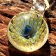 是使用银用做出的颜色,把人工蛋白石放入有透明感的立体的几何学花样正中的设计的玻璃吊坠。