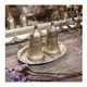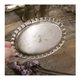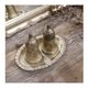 两个设计成优雅小铃铛造型的调味料罐(可作盐罐、胡椒罐等),以及一个手工打造装饰边缘的椭圆形金属收纳盘;整组镀银金属件呈现出经岁月洗链后的温润古朴质感,表面可能带有自然的氧化与使用痕迹,是提升餐桌仪式感、适合古董与复古风格爱好者收藏的典雅餐桌摆件。