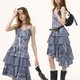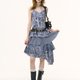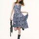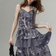 - ziziFei夏季美式复古设计感印花紫色百褶蛋糕下摆吊带连衣长裙女