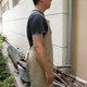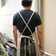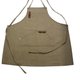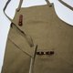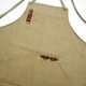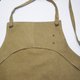 _ 交叉式的绑带法围裙,厚磅刷洗纹帆布有卡其色、铁灰色2色,带一小部分皮革点缀装饰,前有插袋设计。背面贴边式车法。
