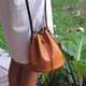 + Crafted from cowhide leather, the durable bag features a circular bottom, a side drawstring closure and a thick long leather strap to wear on the shoulder or crossbody.