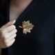 此款胸针为1967年由Sarah Coventry推出,金色柔软的叶片搭配爪镶嵌的仿珠,好像互相在说悄悄话一般,叶片的部分厚度约为1mm,仿珠部分凸出约8mm。品项进全新,仿珠部分有些许小刮痕,但要很近才看得出来。