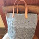 牛皮提把长度30cm 以蜡绳缝合在织物上 袋体参考尺寸: 宽27×高35/cm,底部直径22cm 缝上内衬+暗扣… 织花是搭配拍图的小饰物 无附赠的意思,谢谢关注喔 欢迎各种袋型/线材/色系定制 请在留言处留下消息沟通~