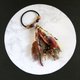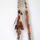 It is a handmade rubber ornament with feather (feather decoration), wood beads, split cloth, silk thread, knit thread, leather strap and so on.