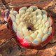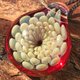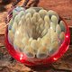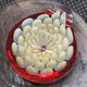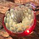 A drop-shaped pendant made of borosilicate glass, which features a combination of a geometric three-dimensional pattern like a succulent plant and a red background.