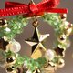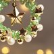 绿色款的花环也是用极光(Aurora)加工的珠子编织而成。在耳畔闪闪发光,非常漂亮!我们以金色星星为主,点缀了带有精致亮粉的珍珠。中央饰以一颗伯利恒之星,并以红色丝带收尾。绿、红、白的圣诞经典配色,使这件作品充满了浓厚的节日氛围!