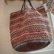 使用纸线编织而成,是大包款,但成品十分的轻巧。 包包主体为咖啡色调间以五颜六色的线条 编织和缕空设计,底部呈圆弧状,是个大容量的草编包款,适合夏季外出使用。 提把长度约30 cm适合手提。