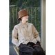 自然的衬衫,图案给了许多脱俗的氛围。小翻领,可爱的领型,花边收着止口,略女性化的柔润。微落肩长袖,有纽扣开合。开门襟,进口的小纽扣匹配,扣眼两色组合,有意留着线头尾巴。宽松的大身,经过压褶之后,更加显瘦。