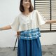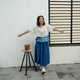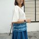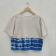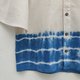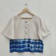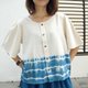 圆领短袖、宽袖靛蓝扎染衬衫。正面带有木纽扣。轻薄的棉质面料非常适合夏天。可爱的设计,凉爽的靛蓝染色图案。