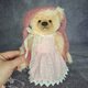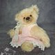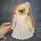 泰迪穿着一件饰有蕾丝的洋装。这件衣服用三颗纽扣固定。熊穿着长裤,上面装饰着缎带和粉红色的木珠。小熊的头上戴着一顶针织小马海毛帽子,帽子上的绳子上装饰着透明的珠子。泰迪脖子上系着一个蝴蝶结。所有衣服均可脱卸。
