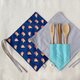 棱形状餐具套,先由上角往下折(缺一角),再由左至右折一角,由左边往右边卷起,最后系起绑带即完成。