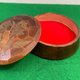 木制复古首饰盒,上面刻有装饰品,周围有美丽的棕色简单图案。 该物品状况非常好。可用作放置在办公桌上或架子上的保存物件。 复古圆形木盒,纪念品记忆,宝藏饰品,硬木箱,衣橱收纳箱,波西米亚风格,红色天鹅绒