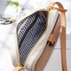 结合质感植鞣皮革与厚车帆布,以简约线条展现自然风格。包身小巧容量充足,能轻松收纳手机、皮夹与随身小物。