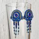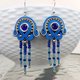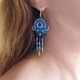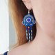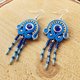 美丽的蓝色长耳环采用索饰刺绣技术制成。材质:珠子、籽珠、吊绳。背面覆盖有皮革。轻的。