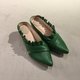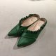 本染皮革制作成手感波浪的荷叶边,从脚内侧延伸绕到外侧,充满知性与甜美的穆勒鞋款。(Mules shoes)。