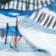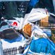 在宁静的冬天里,一间木制客栈屋上积着厚雪、路面也被雪覆盖,坐落在一大片树林前。主要有深蓝色和白色作为衣着穿搭。
