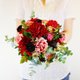 以花材:红色大理花、康乃馨、松虫草、尤加利叶、木谷花等制作。