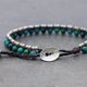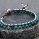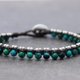 这是一款手工编织的手链,由深棕色蜡线与硅孔雀石一起编织而成