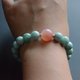 这串拉利玛手串,以10mm的圆珠为主材,取材自多米尼加巴奥鲁科山脉深处的天然针钠钙石。每一颗蓝珠经匠人精磨,色若雾霭笼罩的远海,从浅青到靛蓝的渐变中,偶见针尖大小的天然矿点,需凝神细辨方觉其存在,恰似造物者私藏的暗语。珠体润泽如浸透月光的琉璃,触手生凉,仿佛将波涛的呼吸凝为永恒。 中央一颗14mm的非红玛瑙圆珠,粉橘色调如落日云霞,又似初绽的珊瑚,冰润的质感与拉利玛的冷冽形成微妙对话。玛瑙两侧各缀一枚包K金隔片,璀璨金芒与蓝、粉撞色,暗合“深海与星河”的意象。。 拉利玛被誉为“亚特兰蒂斯的遗泪”,传说能平息浮躁,唤醒内在的澄明;非红玛瑙则象征丰盛与活力,包金隔片更添一份宇宙的浩瀚诗意。整串手串以弹力线穿引,贴合腕骨起伏,10mm的珠径赋予存在感却不显笨重,晃动时蓝珠如浪涌,金辉似流光,粉玛瑙则是浪尖跃出的一抹暖色。 日光下,它是克制的艺术品——蓝与粉的碰撞高级不艳俗,金属细节提升整体贵气;暗处则显幽微神性,拉利玛的蓝更深邃,绯红玛瑙泛出柔润内光。无论搭配棉麻长裙还是西装袖口,它既是锚定气质的焦点,亦是暗藏心事的护身符。腕上这一寸海天相接的风景,终将长成佩戴者的一部分:温柔有棱角,寂静藏波澜。