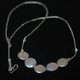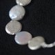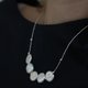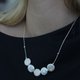 This necklace is composed of 2 button flat-shape white-iridescent pearl beads and 3 handmade geometric shape patterned silver pieces, linked with small sand grain silver beads. It closes with a silver cone-shape hook.