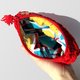 This cosmetic bag, knitted from red T-shirt yarn, is decorated with a small tassel and a wooden tag.