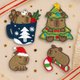 这款刺绣贴纸将杯子、可可奶油、圣诞叶与水豚表情细致呈现。背胶可直接使用,也可缝在布面上: