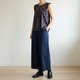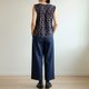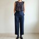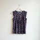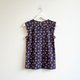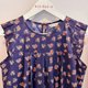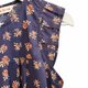 背后有一颗钮扣。这件上衣采用深蓝色棉质布料制成,上面印有橘色花卉图案。