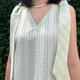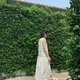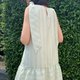 - Long dress with puffy hem, V-neck, buttons on the back and detail on the shoulders to camouflage the upper arms pastel green stripes