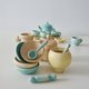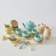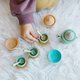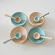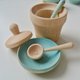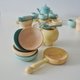 We invented colors and painted this set of dishes by hand. Ware wooden. Linden tree. Varnish safe.