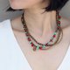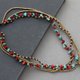 这是手工编织的项链,由深棕色棉蜡线和绿松石和珊瑚编织而成