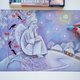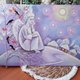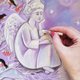 “冬日天使的梦想是什么。”一个白色的体贴天使坐在淡紫色的背景上。他坐在白雪覆盖的山白蜡树上,他梦想着让人们更幸福。附近有红腹灰雀栖息在猩红色的花束和山梣树枝上。远处有白雪覆盖的房屋,月亮皎洁,天上有亮黄色的星星。