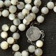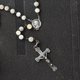 这是天主教念珠项链,通常称为“玫瑰念珠”(Rosary)。每颗念珠是圆型珍珠母贝构成,金属部分为纯银,十字架是镀银耶稣基督雕像构成,并附一个银牌,银牌是圣母玛利亚像。