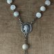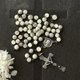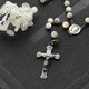 - 这是天主教念珠项链,通常称为“玫瑰念珠”(Rosary)。每颗念珠是圆型珍珠母贝构成,金属部分为镀银,十字架是纯银耶稣基督雕像构成,并附一个银牌,银牌是圣母玛利亚像。这是一种用来在祈祷时计数的珠链。