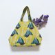 选用日本进口印花棉布,里布搭配几何图形或素面棉布,做成简单小巧手提两用托特包,袋口两边附加羊毛毡球蜡绳,内装物较少时可以打结缩小袋口宽度,东西较多时可使用托特包造型,袋口中央并有磁性铁扣,避免内装物品掉出,充满设计巧思!虽然是手提型的托特包,但平常外出时简单小物都可装入,棉布包轻巧好用,也可避免塞入太多物品造成包包太重而导致腰酸背痛的情形!