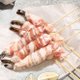 手工串签、串卷,内层为肉质紧实鲜甜的剥壳草虾,接着包覆咸香的国产台湾猪培根和油花丰富的胸腹肉猪五花。