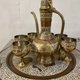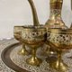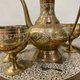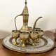 这款以黄铜制作而成的精美古董茶具来自印度,仿制阿拉伯风格打造而成。整套包含一个茶壶、一个托盘和六个高脚杯。每件作品都是由黄铜制成,外观有着繁复的花纹设计,带有神秘的中东色彩。