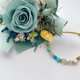 水晶选用莫桑比克天河石(希望之石) & 蓝磷灰石的手链。花束搭配迷雾绿的永生玫瑰,点缀一点蓝和多色阶的绿,最后用黄色表达希望之意。💚💙💛