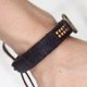 这是一款手工串珠手链,由棕色皮革带和黄铜珠编织而成。