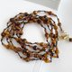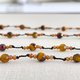 以圆形切割的虎眼石为主石,两侧各以两颗同色系的红榴石点缀,串连于丝线编织的长项链上。